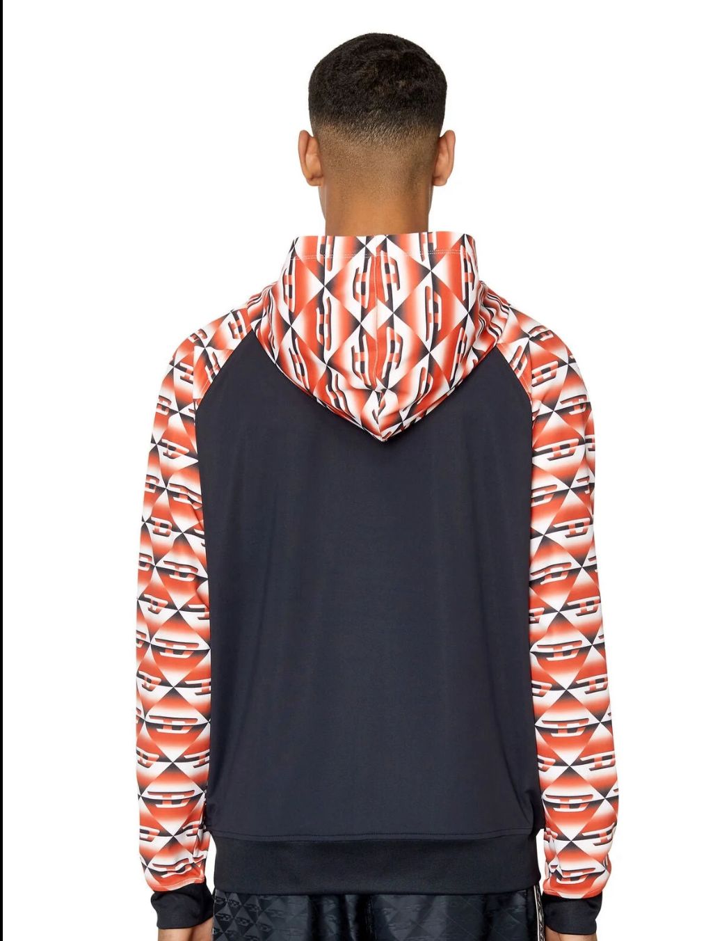 Parte de la colección DIESEL SPORT, esta sudadera con capucha para hombre está confeccionada en tejido transpirable con paneles de jersey técnico y un estampado gráfico del logotipo "D". Tiene cuello con cordones, bolsillo canguro y ribetes de punto sin costuras. El canesú luce un escudo con el logotipo y un parche "55DSL".